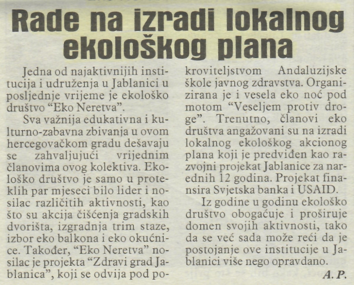 EKO-Neretva u Jablanici Prepoznatljivi po uspjesima Ovdašnji ekolozi, njih oko 700, do sada su realizirali više od trideset projekata sa domaćim i međunarodnim partnerima Nevladina organizacija EKO-Ne...