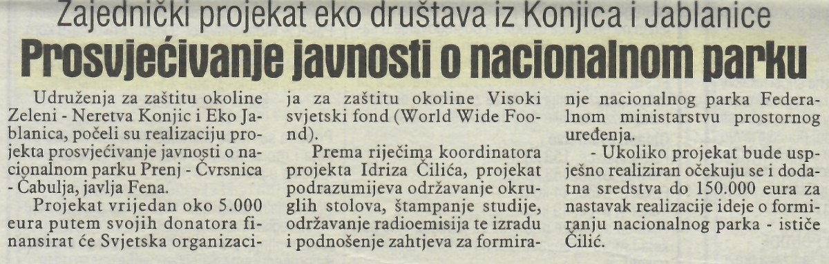 Prosvjećivanje javnosti o nacionalnom parku 30.09.2003. Zajednički projekat Konjic - Jablanica