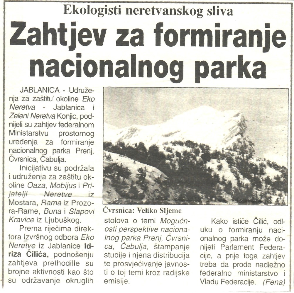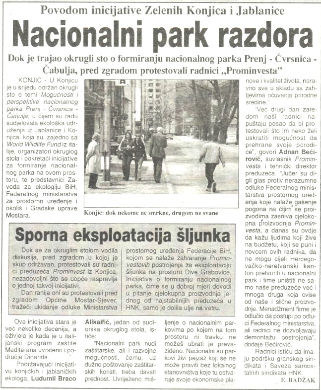 Nacionalni park razdora 17.10.2003. Javna rasprava i protesti U Konjicu je održan okrugli sto o temi "Mogućnosti i perspektive nacionalnog parka Prenj - Čvrsnica - Čabulja", u čijem su radu sudjeloval...